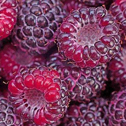 Floricane. An improved version of the classic "black cap" raspberry. These raspberries are a deep purple because they have been the product of cross-breeding the abundant wild black cap variety with Latham. Yielding very large, low seed, highly productive berries, that will produce in early summer and fall. A great all-around raspberry for fresh and preservation.