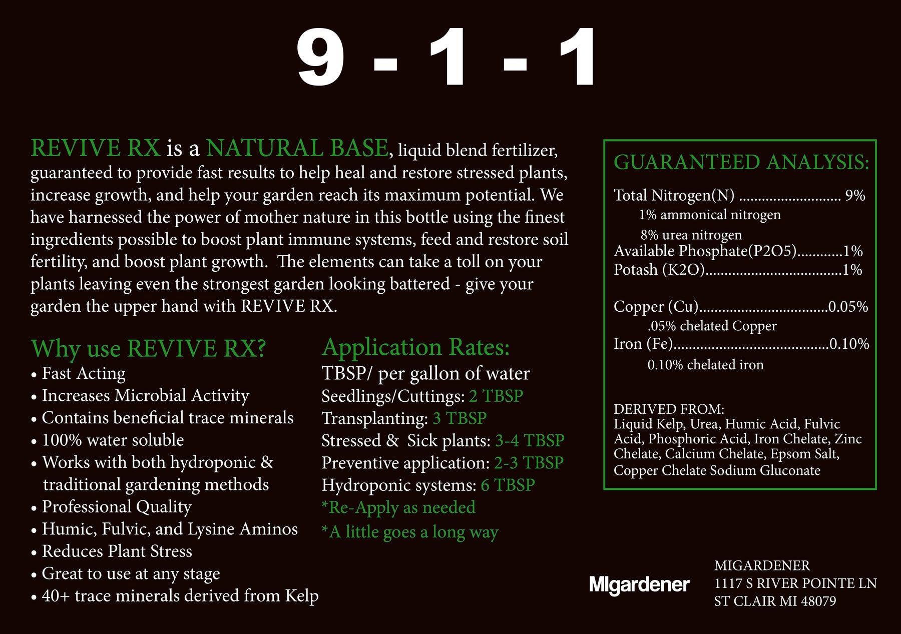 Revive Rx is the latest in the MIgardener plant food line. By harnessing the power of mother nature we have made it possible to have a highly potent liquid-based fertilizer that is 100% water soluble. This can be used when starting seedlings, taking cuttings, reviving sick plants, used in drip systems, and hydroponics. With High nitrogen, gentle but balanced phosphorus and potassium, humic, fulvic, & lysine amino acids along with over 40 trace minerals plant stress will be a thing of the past and insane growth will be the new norm. Fast acting when you need it most.